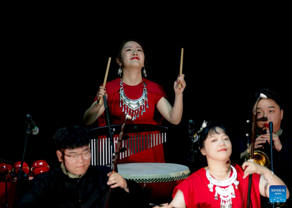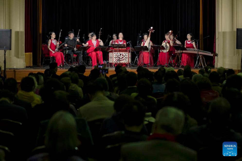 Artists from southwest China's Guizhou Province perform during a folk music concert to celebrate the Mid-Autumn Festival in Canberra, Australia, Sept. 17, 2024. (Photo by Chu Chen/Xinhua)