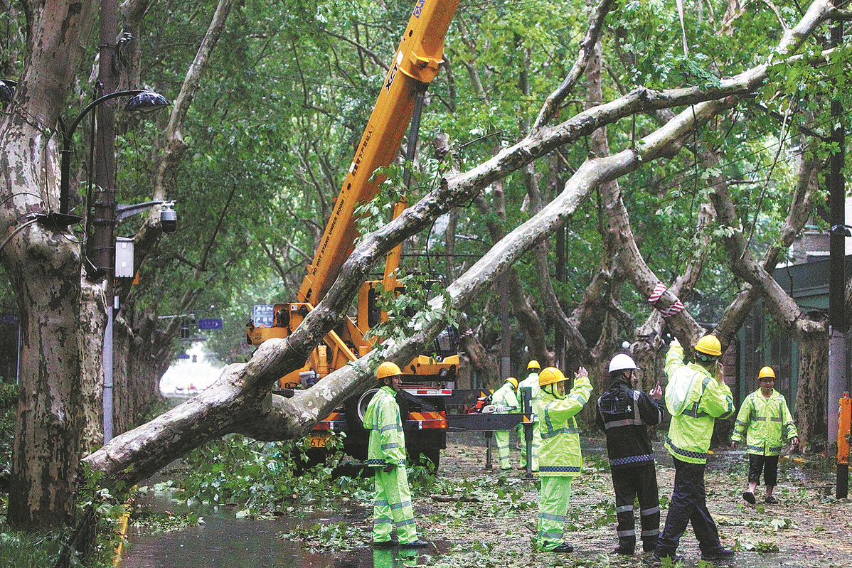 Workers remove a fallen tree on Hengshan Road in Shanghai on Monday. Typhoon Bebinca, the 13th typhoon of the year, made landfall on the city's coast at 7:30 am. (CHEN HAOMING/XINHUA)