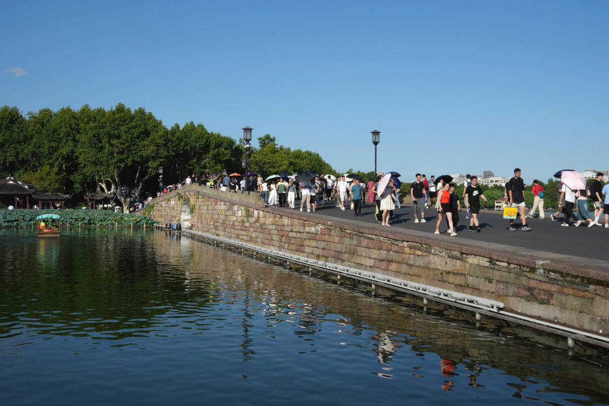 Tourists walk on Duanqiao Bridge (Broken Bridge) in the West Lake scenic area in Hangzhou, East China's Zhejiang province, Sept 17, 2024. (Photo/Xinhua)