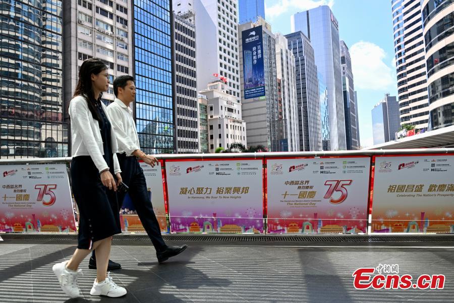 Posters themed on the 75th anniversary of the founding of the People's Republic of China are hung on a street in the Hong Kong Special Administrative Region (HKSAR), Sept. 17, 2024. (Photo: China News Service/ Li Zhihua)
