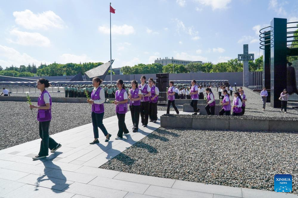 People present flowers during an activity marking the 93rd anniversary of the "September 18 Incident" at the Memorial Hall of the Victims in Nanjing Massacre by Japanese Invaders in Nanjing, east China's Jiangsu Province, Sept. 18, 2024. People from Nanjing and other places commemorated the 93rd anniversary of September 18 Incident, which marked the outbreak of Japan's large-scale invasion of China. (Xinhua/Li Bo)