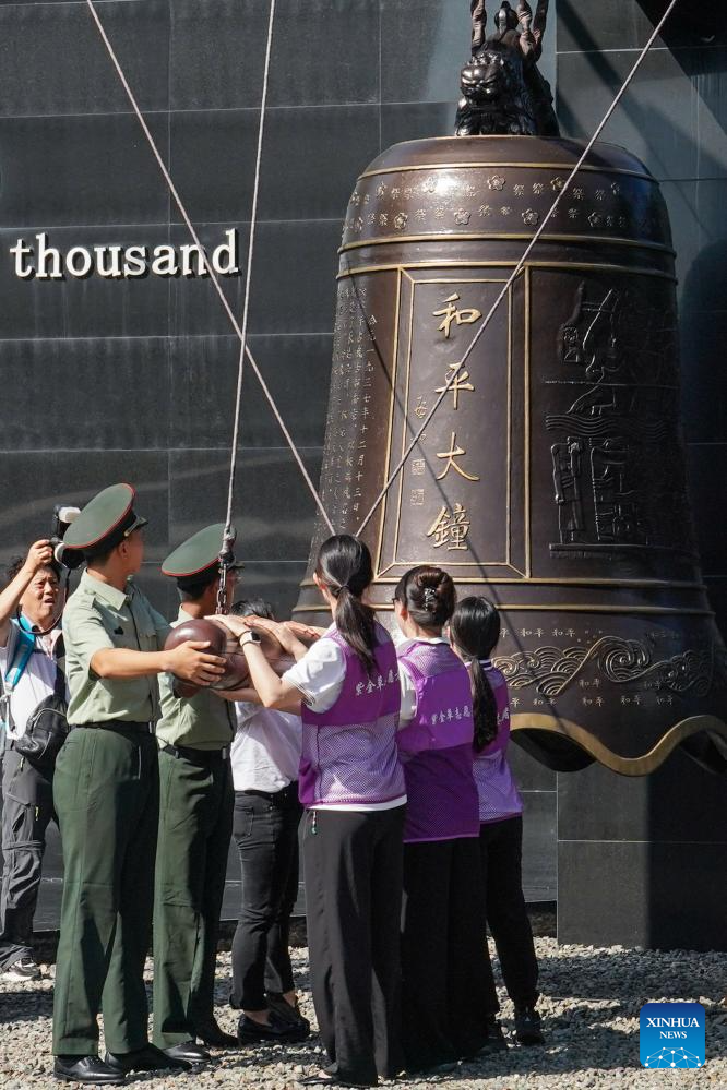 People strike the Bell of Peace at the Memorial Hall of the Victims in Nanjing Massacre by Japanese Invaders in Nanjing, east China's Jiangsu Province, Sept. 18, 2024. People from Nanjing and other places commemorated the 93rd anniversary of September 18 Incident, which marked the outbreak of Japan's large-scale invasion of China. (Xinhua/Li Bo)