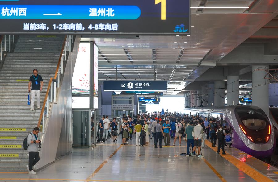 The bullet train number G9505 is pictured at Hangzhouxi Railway Station ahead of its maiden trip on the Hangzhou-Wenzhou high-speed railway in Hangzhou, East China's Zhejiang province, Sept 6, 2024. (Photo/Xinhua)