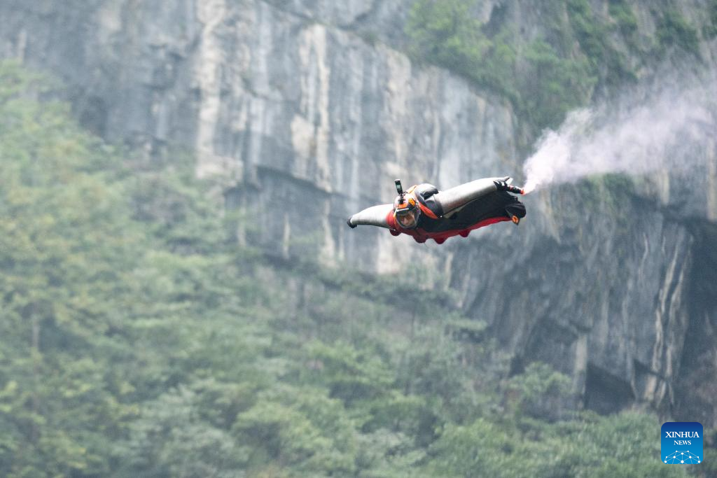 JJ Wallis of South Africa competes during the flying through targets competition at the 10th World Wingsuit League (WWL) Wingsuit Flying World Championship at the Tianmen Mountain National Forest Park in Zhangjiajie, central China's Hunan Province, on Sept. 19, 2024. (Xinhua/Chen Sihan)