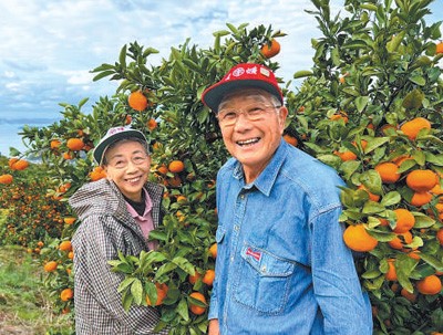 Photo shows Yoshimoto Tadashi and his wife in their citrus orchard in Uwajima, Ehime Prefecture, Japan. (Photo provided by Yoshimoto Tadashi)