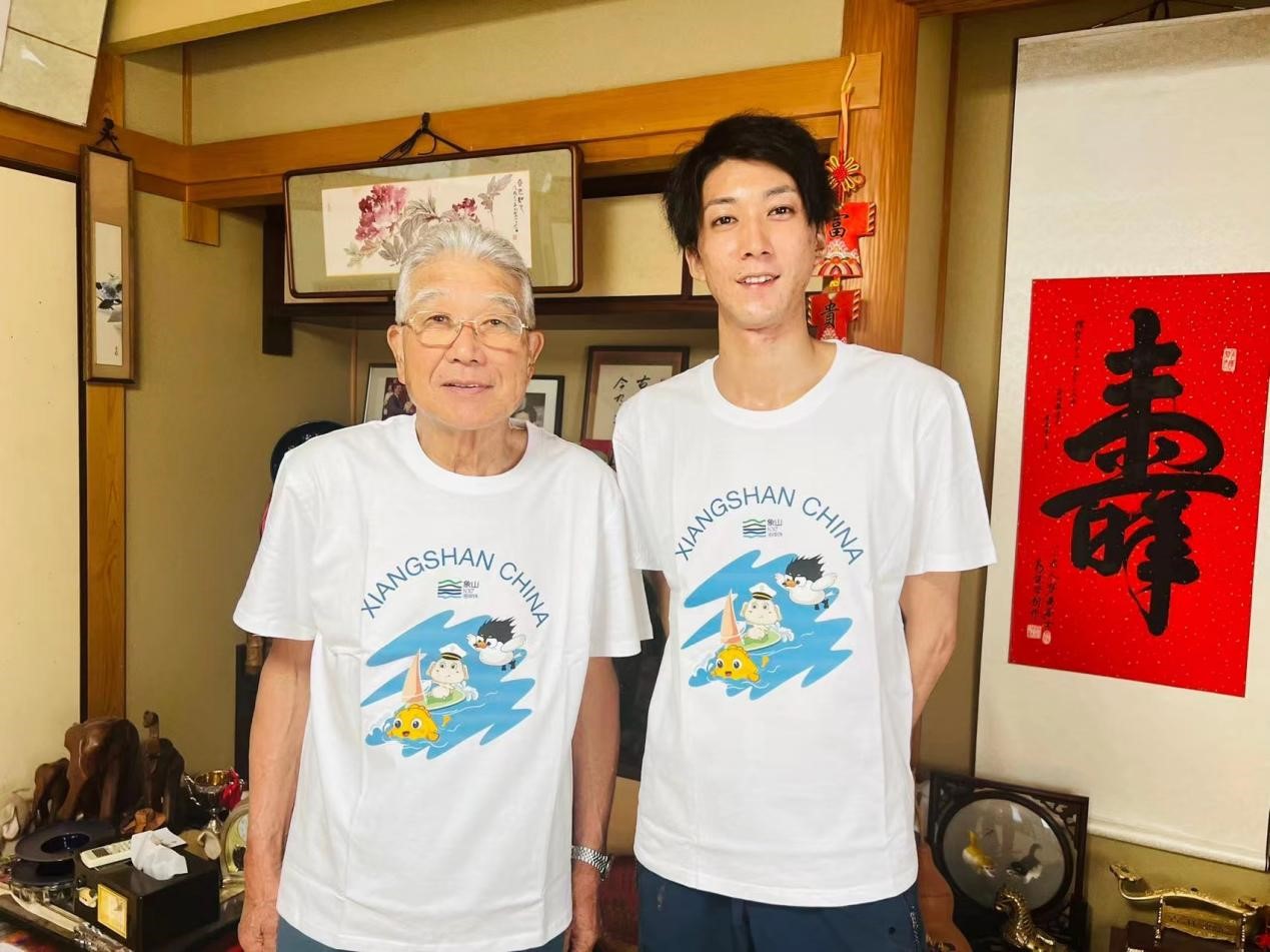 Yoshimoto Tadashi and his grandson pose for a picture in Xiangshan souvenir shirts at the second floor of their house. (Photo provided by Yoshimoto Tadashi)