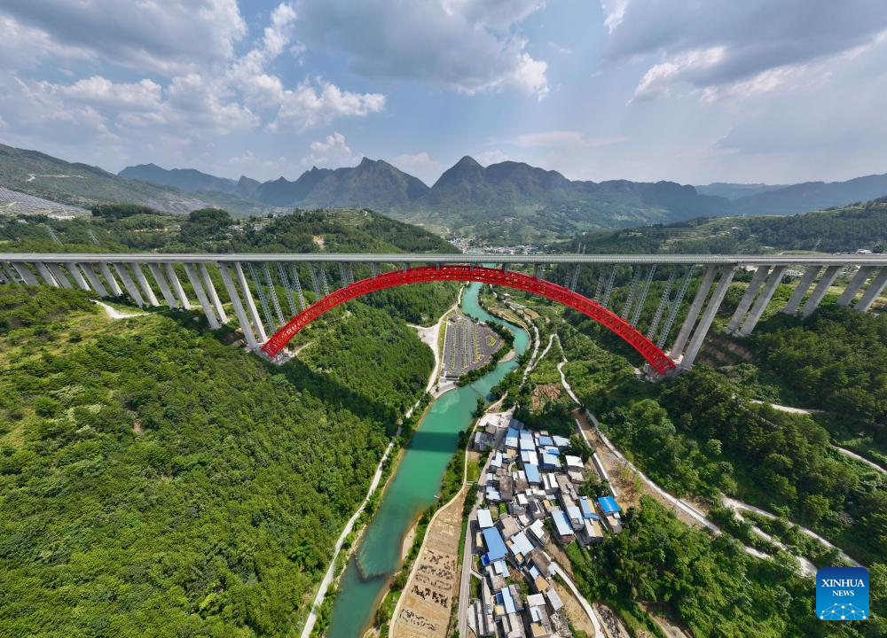 An aerial panoramic photo taken with a drone shows the Daxiaojing grand bridge on the expressway linking Pingtang and Luodian in southwest China's Guizhou Province, Sept. 5, 2024. (Xinhua/Ou Dongqu)