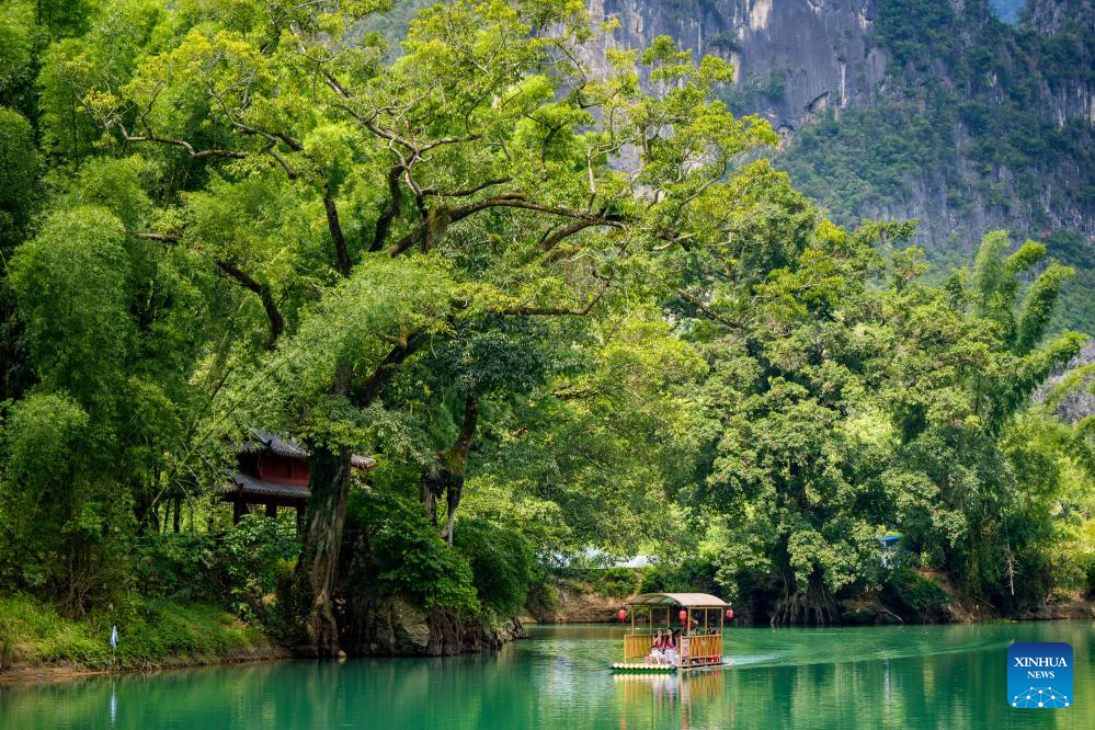 A drone photo shows a bamboo raft carrying tourists at a scenic spot near the Daxiaojing grand bridge in southwest China's Guizhou Province, Sept. 5, 2024. (Xinhua/Liu Xu)