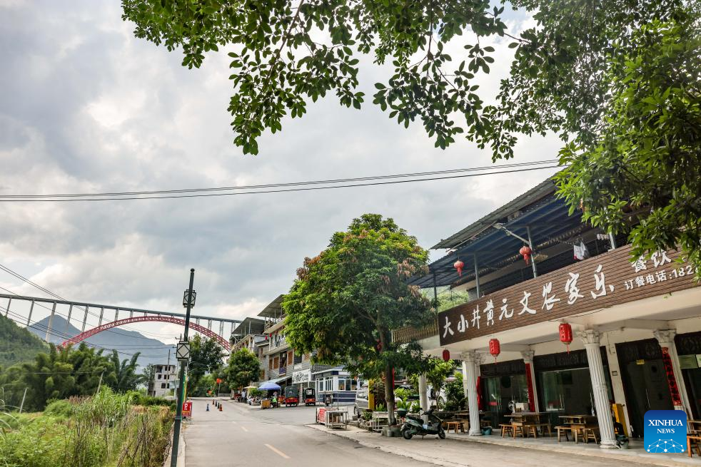 This photo shows restaurants and homestay at a scenic spot near the Daxiaojing grand bridge in southwest China's Guizhou Province, Sept. 5, 2024. (Xinhua/Liu Xu)