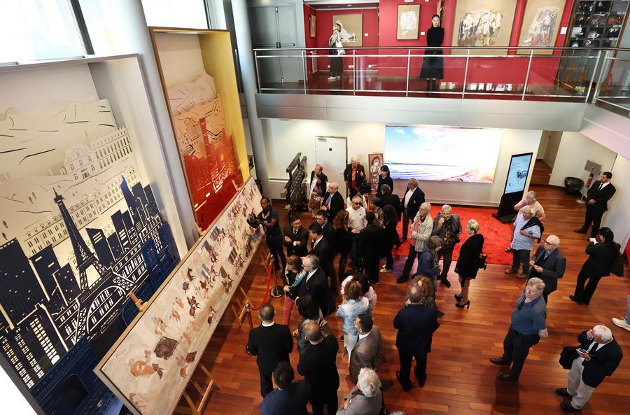 Guests visit the Silk Road Danqing, an exhibition of copies of cave temple mural paintings along the ancient Silk Road at the China Cultural Center in Paris, France, Sept. 18, 2024. (Xinhua/Gao Jing)