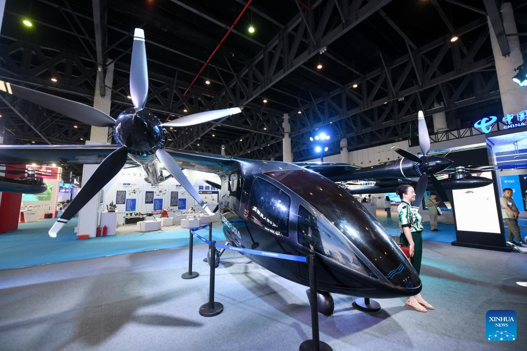 This photo taken on Sept. 20, 2024 shows an electric aircraft displayed at the 2024 Chengdu International Low-altitude Equipment and Services Expo in Chengdu, southwest China's Sichuan Province. The 2024 China (Chengdu) International Low-altitude Economic Partnership Conference &2024 Chengdu International Low-altitude Equipment and Services Expo is held here from Sept. 19 to 21, showcasing cutting-edge technologies and new products in low-altitude economy. (Xinhua/Tang Wenhao)