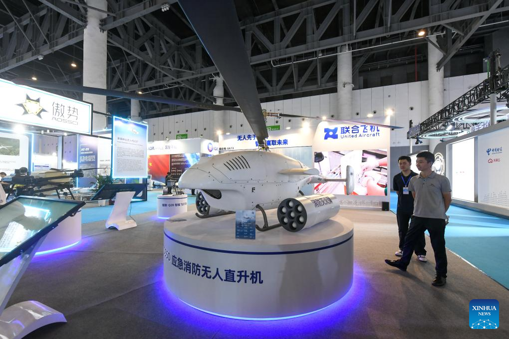 Visitors view an unmanned helicopter for emergency and firefighting operation displayed at the 2024 Chengdu International Low-altitude Equipment and Services Expo in Chengdu, southwest China's Sichuan Province, Sept. 20, 2024. The 2024 China (Chengdu) International Low-altitude Economic Partnership Conference &2024 Chengdu International Low-altitude Equipment and Services Expo is held here from Sept. 19 to 21, showcasing cutting-edge technologies and new products in low-altitude economy. (Xinhua/Tang Wenhao)