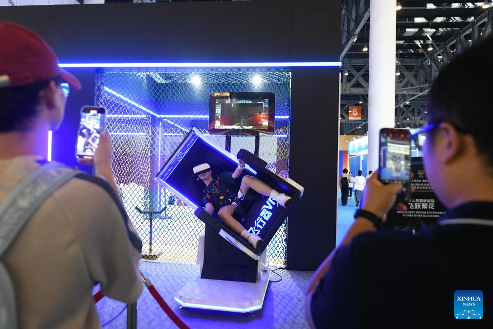 A visitor tries a simulated piloting device for unmanned aerial vehicles (UAV) at the 2024 Chengdu International Low-altitude Equipment and Services Expo in Chengdu, southwest China's Sichuan Province, Sept. 20, 2024. The 2024 China (Chengdu) International Low-altitude Economic Partnership Conference &2024 Chengdu International Low-altitude Equipment and Services Expo is held here from Sept. 19 to 21, showcasing cutting-edge technologies and new products in low-altitude economy. (Xinhua/Tang Wenhao)