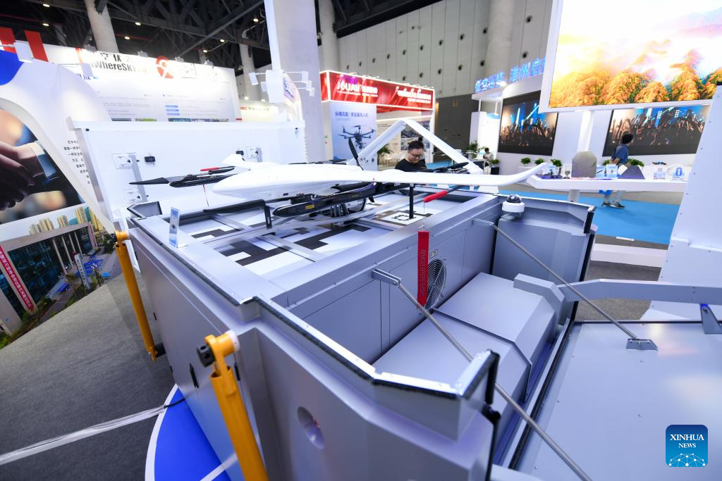 This photo taken on Sept. 20, 2024 shows a hangar platform for unmanned aerial vehicles (UAV) displayed at the 2024 Chengdu International Low-altitude Equipment and Services Expo in Chengdu, southwest China's Sichuan Province. The 2024 China (Chengdu) International Low-altitude Economic Partnership Conference &2024 Chengdu International Low-altitude Equipment and Services Expo is held here from Sept. 19 to 21, showcasing cutting-edge technologies and new products in low-altitude economy. (Xinhua/Tang Wenhao)