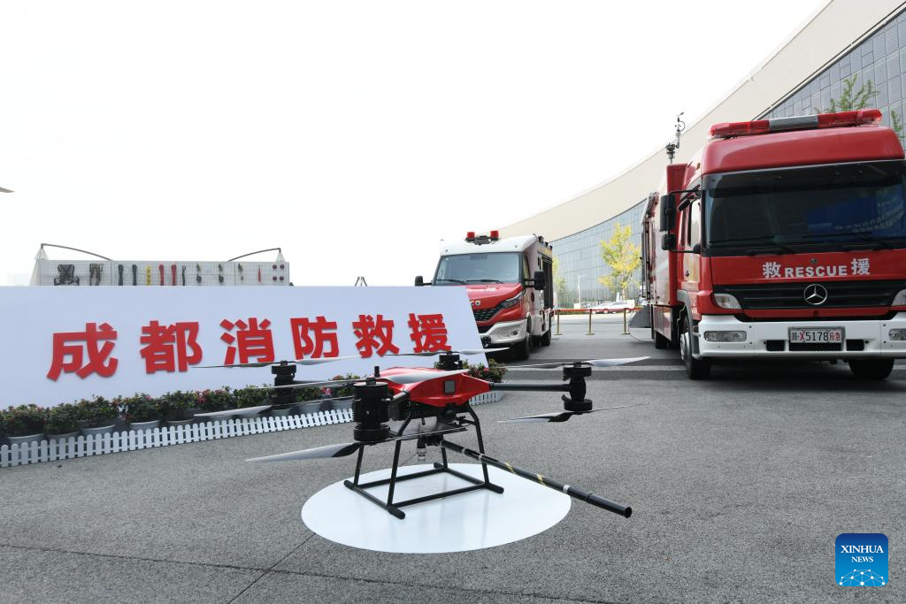 This photo taken on Sept. 20, 2024 shows firefighting and rescue equipment displayed at the 2024 Chengdu International Low-altitude Equipment and Services Expo in Chengdu, southwest China's Sichuan Province. The 2024 China (Chengdu) International Low-altitude Economic Partnership Conference &2024 Chengdu International Low-altitude Equipment and Services Expo is held here from Sept. 19 to 21, showcasing cutting-edge technologies and new products in low-altitude economy. (Xinhua/Tang Wenhao)