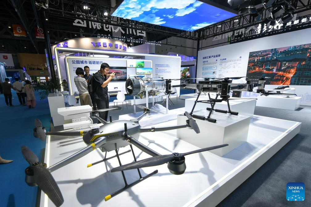 This photo taken on Sept. 20, 2024 shows a scene of the 2024 Chengdu International Low-altitude Equipment and Services Expo in Chengdu, southwest China's Sichuan Province. The 2024 China (Chengdu) International Low-altitude Economic Partnership Conference &2024 Chengdu International Low-altitude Equipment and Services Expo is held here from Sept. 19 to 21, showcasing cutting-edge technologies and new products in low-altitude economy. (Xinhua/Tang Wenhao)
