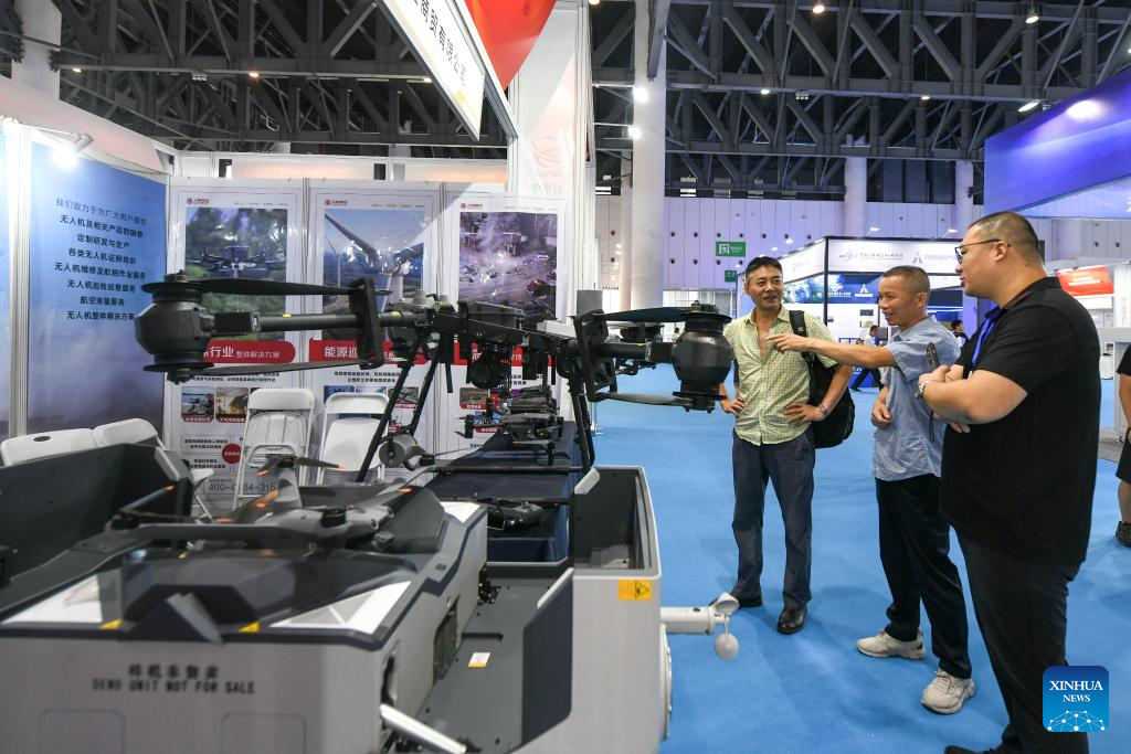Visitors look at unmanned aerial vehicle (UAV) products at the 2024 Chengdu International Low-altitude Equipment and Services Expo in Chengdu, southwest China's Sichuan Province, Sept. 20, 2024. The 2024 China (Chengdu) International Low-altitude Economic Partnership Conference &2024 Chengdu International Low-altitude Equipment and Services Expo is held here from Sept. 19 to 21, showcasing cutting-edge technologies and new products in low-altitude economy. (Xinhua/Tang Wenhao)