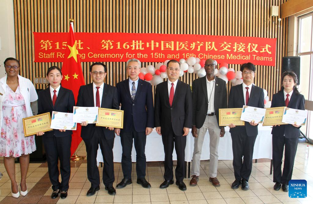 Namibia's Ministry of Health and Social Services (MoHSS) Acting Executive Director Jeremia Nghipundjua (3rd R) attends a rotating ceremony for the 15th and 16th Chinese medical teams at the Katutura Intermediate Hospital in Windhoek, Namibia, on Sept. 20, 2024. Namibia's Ministry of Health and Social Services (MoHSS) is considering expanding Chinese medical services across the country, following the growing popularity of the services among Namibians, according to Nghipundjua. (Photo by Musa C Kaseke/Xinhua)