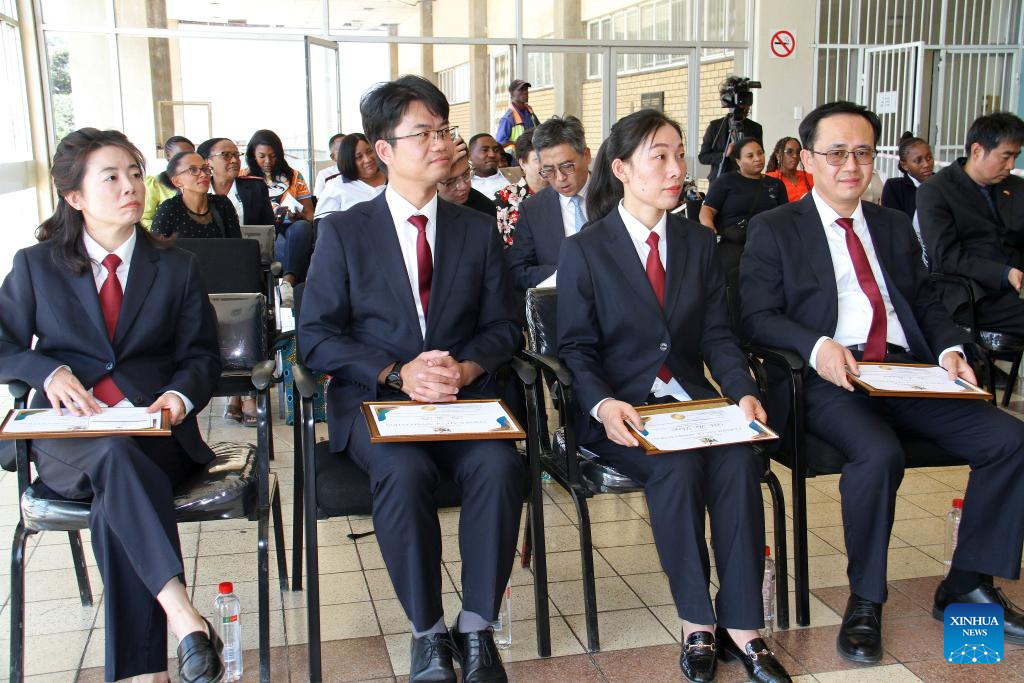 Members of the 15th Chinese medical team attend a rotating ceremony for the 15th and 16th Chinese medical teams at the Katutura Intermediate Hospital in Windhoek, Namibia, on Sept. 20, 2024. Namibia's Ministry of Health and Social Services (MoHSS) is considering expanding Chinese medical services across the country, following the growing popularity of the services among Namibians, according to MoHSS Acting Executive Director Jeremia Nghipundjua. (Photo by Musa C Kaseke/Xinhua)
