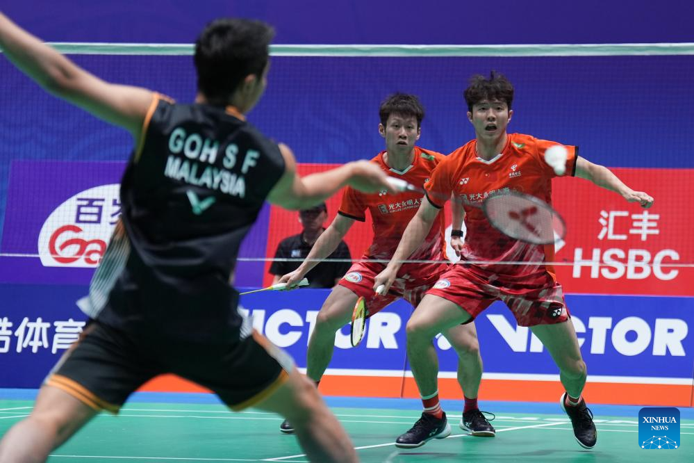 He Jiting (R)/Ren Xiangyu of China compete during the men's doubles final match against Goh Sze Fei/Nur Izzuddin of Malaysia at the China Open 2024 badminton tournament in Changzhou, east China's Jiangsu Province, Sept. 22, 2024. (Xinhua/Li Bo)