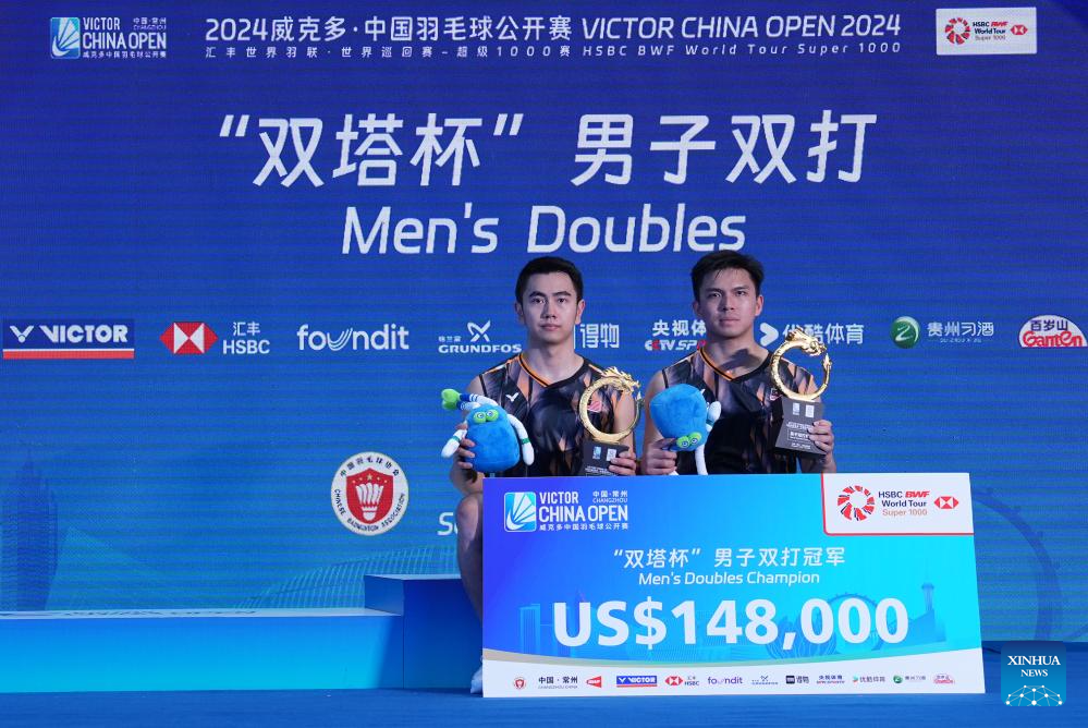 Winners Goh Sze Fei/Nur Izzuddin (R) of Malaysia pose during the awarding ceremony for the men's doubles event at the China Open 2024 badminton tournament in Changzhou, east China's Jiangsu Province, Sept. 22, 2024. (Xinhua/Li Bo)