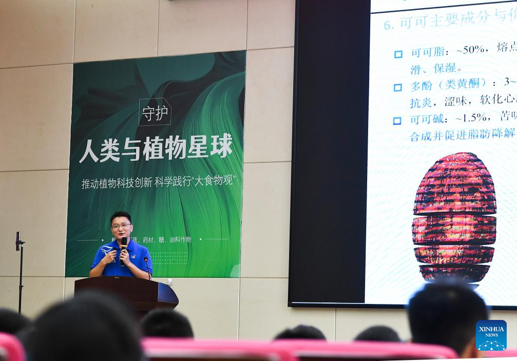 Researcher Li Fupeng gives a lecture about cocoa to students in Wanning City, south China's Hainan Province, Sept. 22, 2024. The science popularization activity focusing on cocoa was held here on Sunday by Spice and Beverage Research Institute under Chinese Academy of Tropical Agricultural Sciences. (Xinhua/Yang Guanyu)