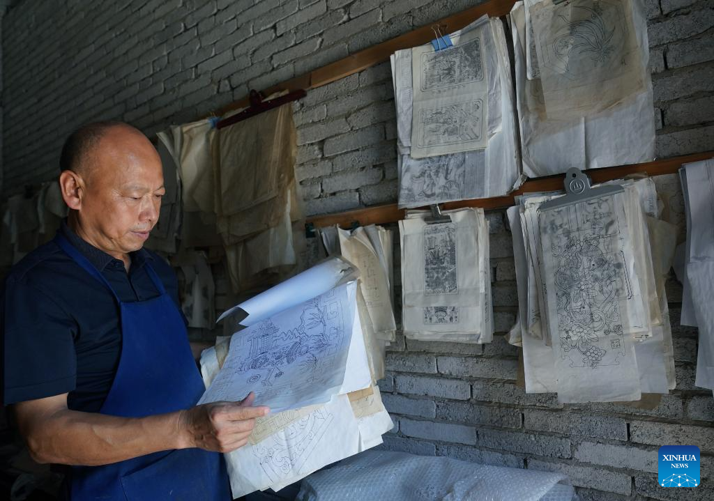 Yu Youhong browses through carving patterns in Wangkou Village of Wuyuan County, east China's Jiangxi Province, Sept. 20, 2024. (Xinhua/Wan Xiang)