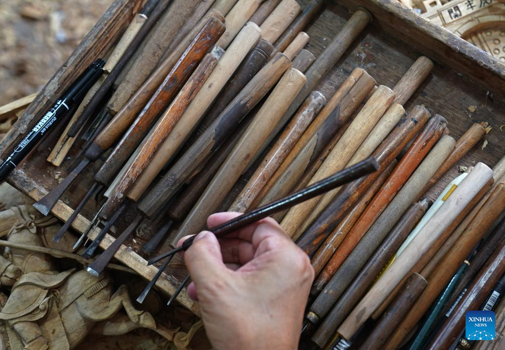 Yu Youhong picks a carving knife in Wangkou Village of Wuyuan County, east China's Jiangxi Province, Sept. 20, 2024. (Xinhua/Wan Xiang)