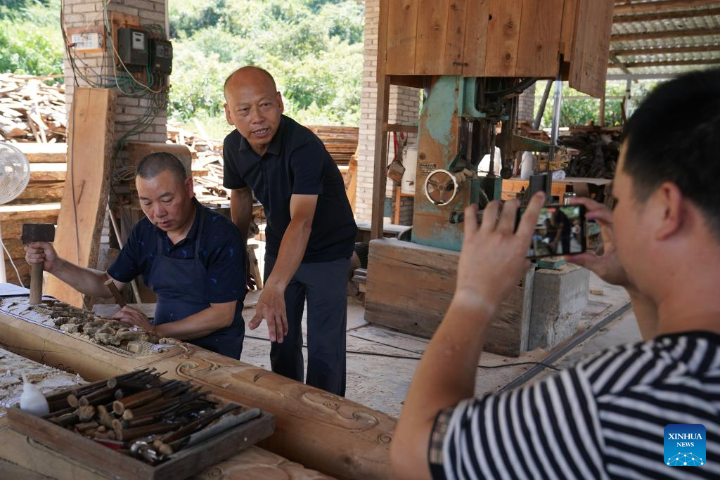Yu Youhong carves wood in Wangkou Village of Wuyuan County, east China's Jiangxi Province, Sept. 20, 2024. (Xinhua/Wan Xiang)