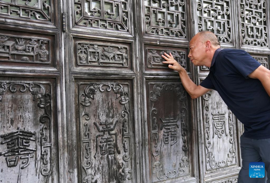 Yu Youhong checks wood carving in a residential building in Wangkou Village of Wuyuan County, east China's Jiangxi Province, Sept. 20, 2024. (Xinhua/Wan Xiang)