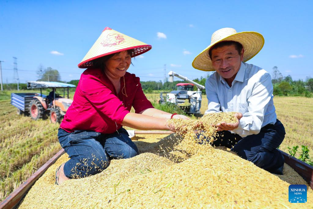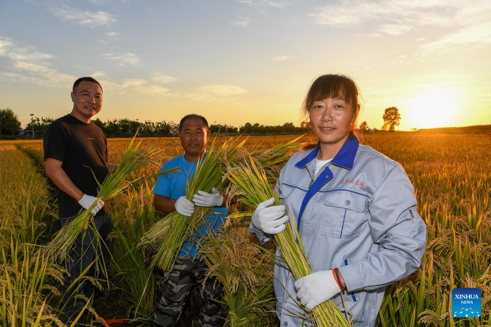 Farmers harvest rice at Zhanglou Village of Xinyang City, central China's Henan Province, Sept. 22, 2024. (Photo by Xie Wanbo/Xinhua)