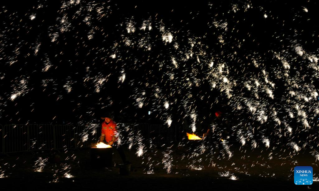 Folk artists throw molten iron to create fireworks in Haiyang, east China's Shandong Province, Sept. 21, 2024. The event aims to commemorate the seventh Chinese farmers' harvest festival which falls on Sept. 22 this year. (Xinhua/Xu Suhui)