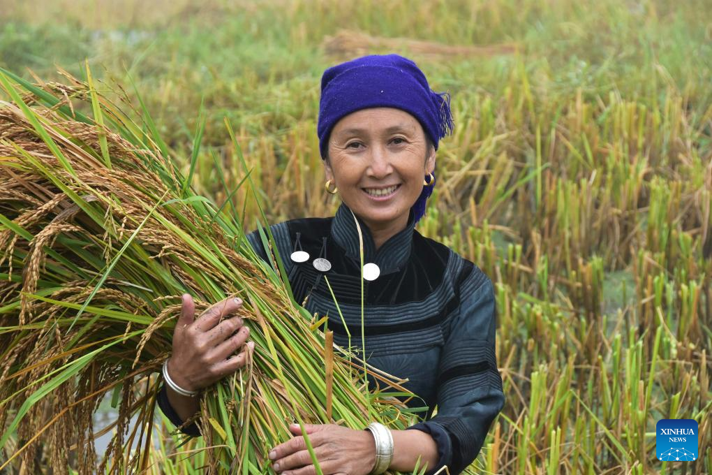 A farmer holds harvested rice at Yuanyang County of Honghe Hani and Yi Autonomous Prefecture, southwest China's Yunnan Province, Sept. 22, 2024. (Photo by Xue Yingying/Xinhua)