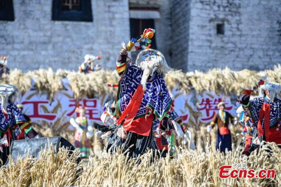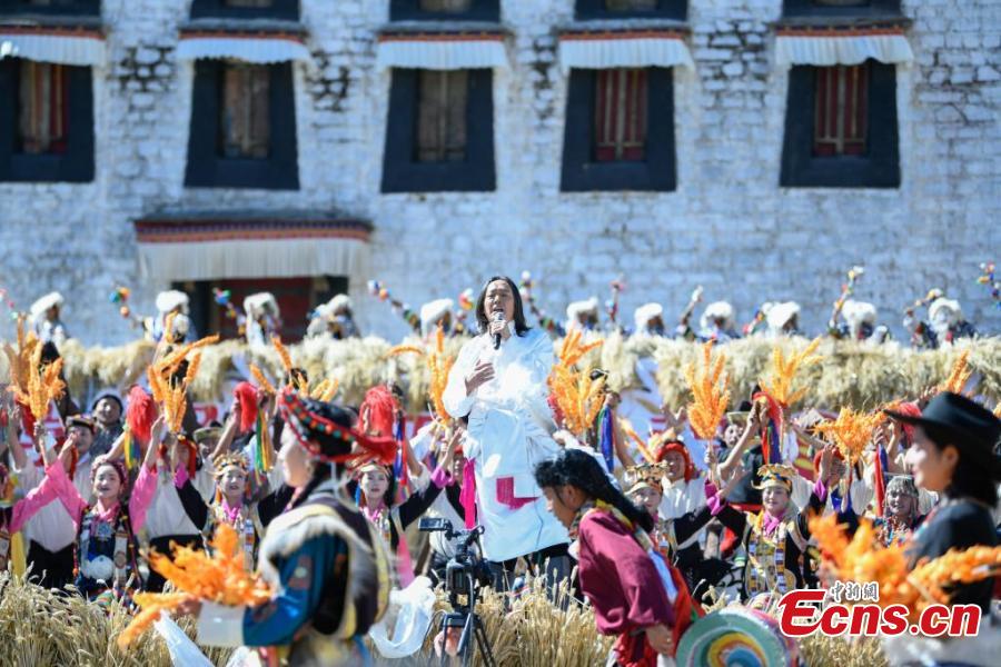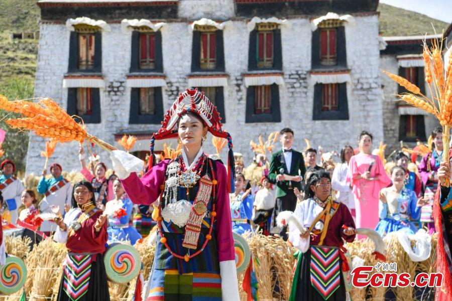 A performance is staged to celebrate the 7th Chinese Farmers' Harvest Festival in Shannan City, southwest China's Xizang Autonomous Region, Sept. 22, 2024. (Photo/China News Service)