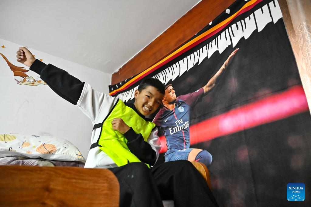 A soccer player at school, Tsechok Dorje likes wearing his training vest even at "home" and dreams of becoming a professional soccer player when he grows up. On a wall in his room, where four children live in bunk beds, is a poster of the Brazilian soccer player Neymar.