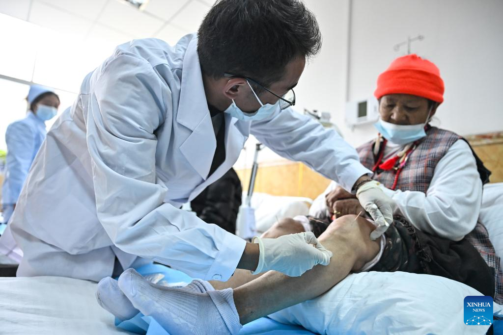 A doctor from a Tibetan medicinal hospital provides acupuncture treatment to a Tibetan woman at a care center in Ngari Prefecture, southwest China's Xizang Autonomous Region, Sept. 14, 2024. (Xinhua/Sun Ruibo)