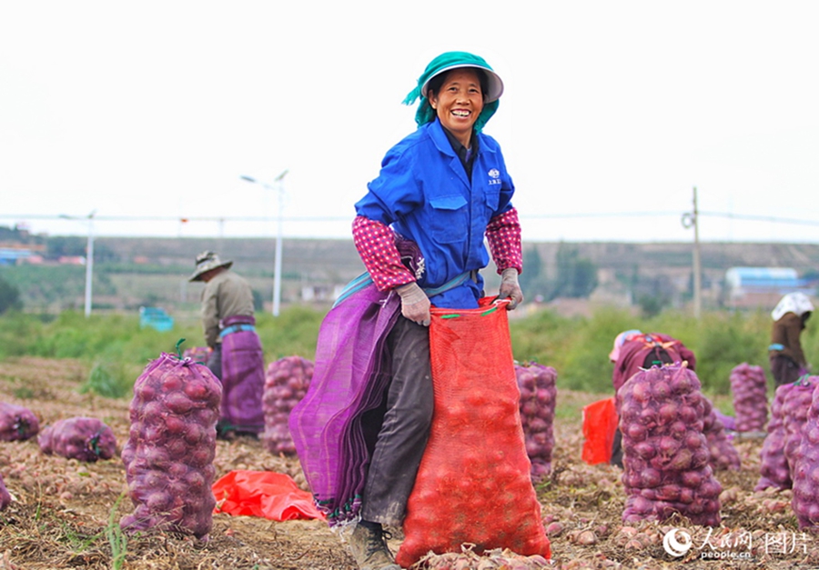 A farmer smiles as she carries a bag of onions in Manwan village, Xicha township, Lanzhou city, northwest China's Gansu Province, Sept. 21, 2024. (People's Daily Online/Mi Yuan)