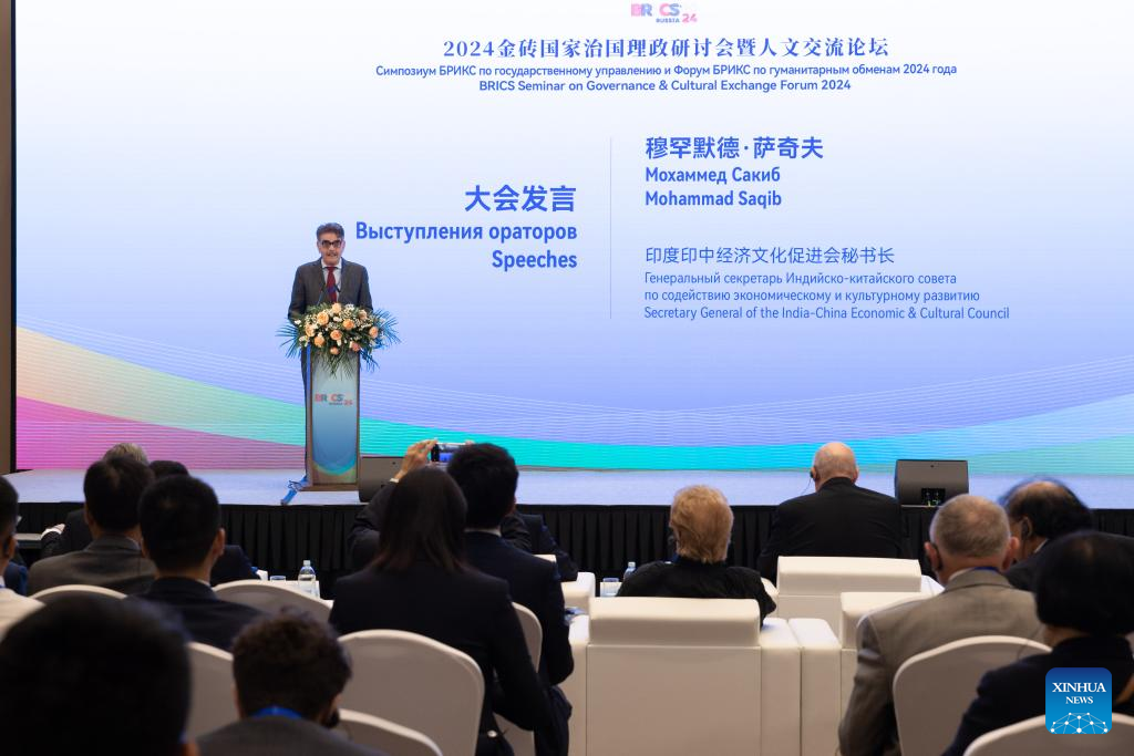 Mohammad Saqib, secretary general of the India-China Economic & Cultural Council, speaks during the BRICS Seminar on Governance &Cultural Exchanges Forum 2024 in Moscow, Russia, Sept. 23, 2024. (Xinhua/Bai Xueqi)