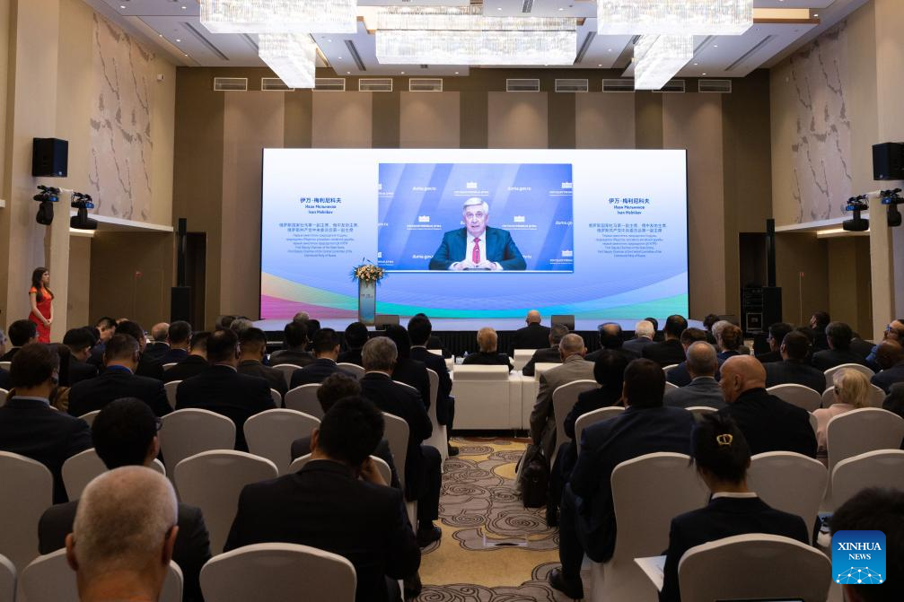 Ivan Melnikov, first deputy chairman of the State Duma, also first deputy chairman of the Central Committee of the Communist Party of Russia, speaks via video link during the BRICS Seminar on Governance & Cultural Exchanges Forum 2024 in Moscow, Russia, Sept. 23, 2024. (Xinhua/Bai Xueqi)