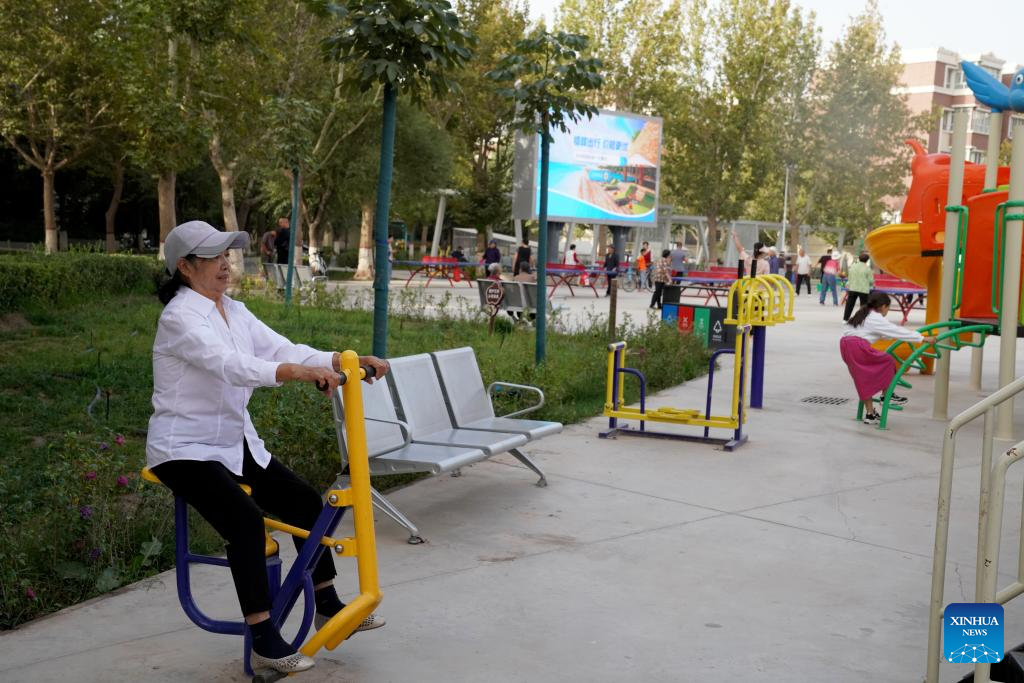 Residents do morning exercises on a square of the Donghu residential community in Kashgar, northwest China's Xinjiang Uygur Autonomous Region, Sept. 22, 2024. (Xinhua/Zhao Yusi)