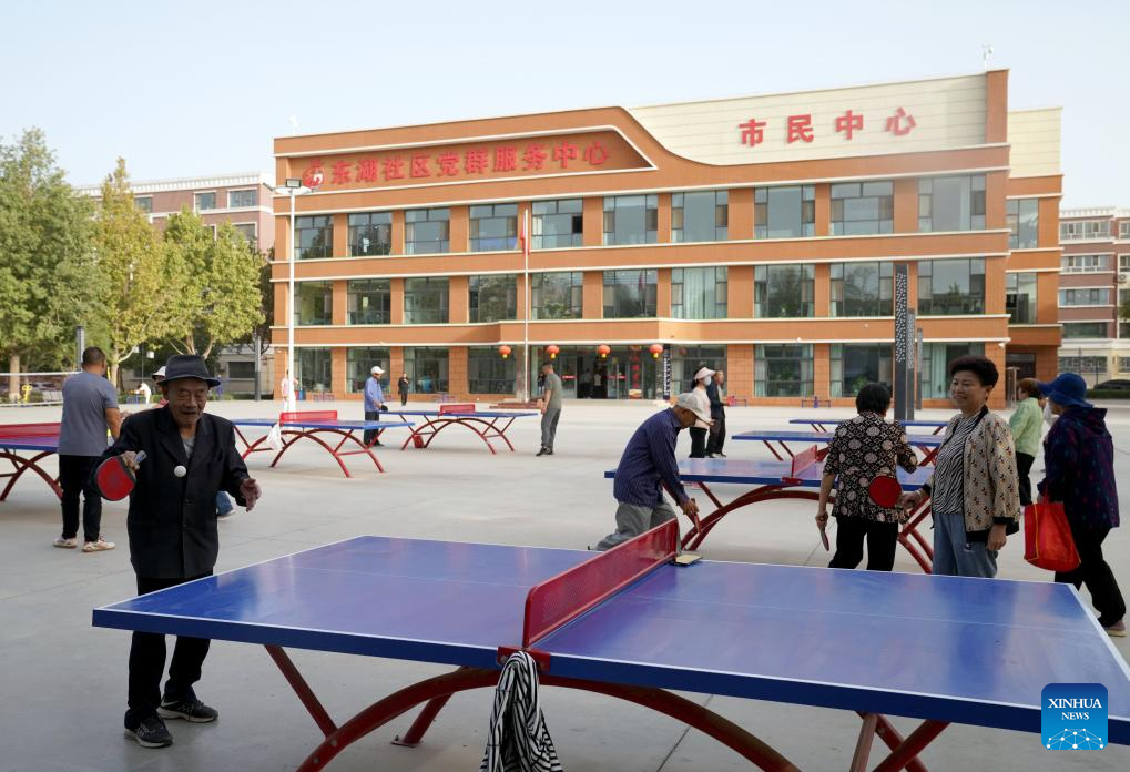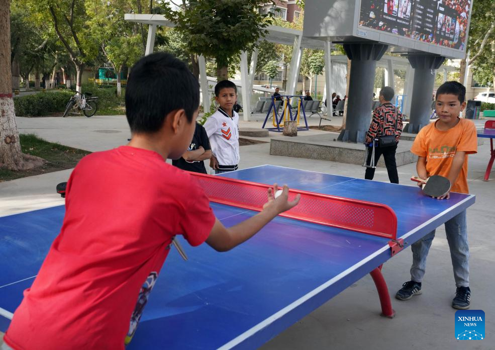 Residents play table tennis at the Donghu residential community in Kashgar, northwest China's Xinjiang Uygur Autonomous Region, Sept. 22, 2024. (Xinhua/Zhao Yusi)