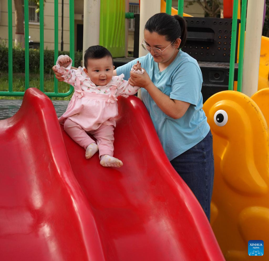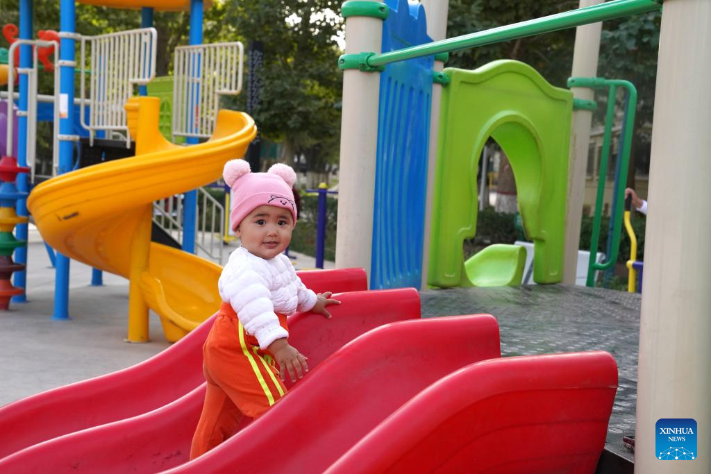 A child has fun at a playground of the Donghu residential community in Kashgar, northwest China's Xinjiang Uygur Autonomous Region, Sept. 22, 2024. (Xinhua/Zhao Yusi)
