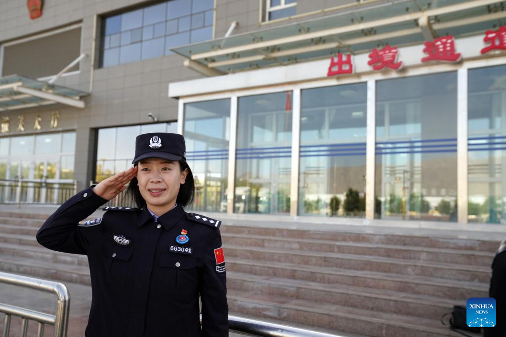 A police officer of Khunjerab border inspection station is pictured on duty at the Khunjerab Pass in Kashgar, northwest China's Xinjiang Uygur Autonomous Region, Sept. 20, 2024. Khunjerab Pass is a land port on the China-Pakistan border and an important gateway to South Asia and Europe. The pass used to offer seasonal access service that started on April 1 and ended on Nov. 30, but it has shifted to full-year service as of Sept. 20 this year. (Xinhua/Zhao Yusi)