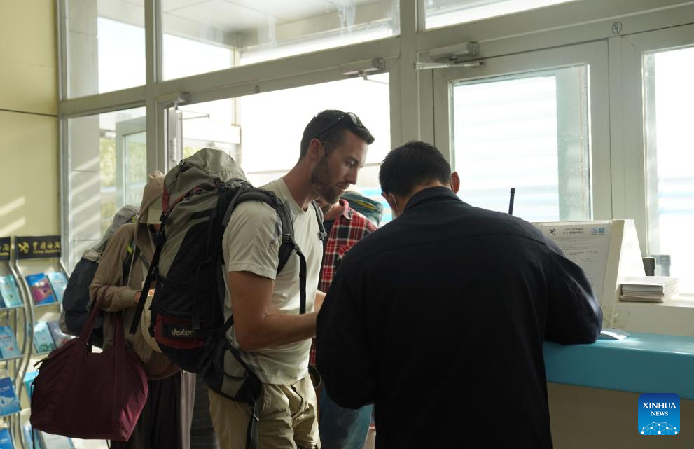 A police officer of Khunjerab border inspection station (R, front) helps a Swiss tourist at the Khunjerab Pass in Kashgar, northwest China's Xinjiang Uygur Autonomous Region, Sept. 20, 2024. Khunjerab Pass is a land port on the China-Pakistan border and an important gateway to South Asia and Europe. The pass used to offer seasonal access service that started on April 1 and ended on Nov. 30, but it has shifted to full-year service as of Sept. 20 this year. (Xinhua/Zhao Yusi)