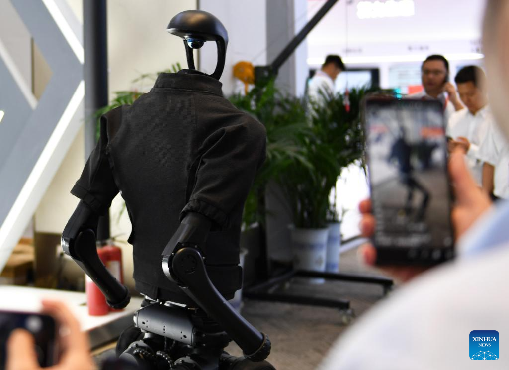Visitors look at a robot on display at an exhibition during the 2024 World Computing Conference in Changsha, central China's Hunan Province, Sept. 24, 2024. Under the theme "Calculating the World to Create a New Era -- Calculating the New Quality Productive Forces," the conference opened Tuesday in Changsha. (Xinhua/Chen Zhenhai)