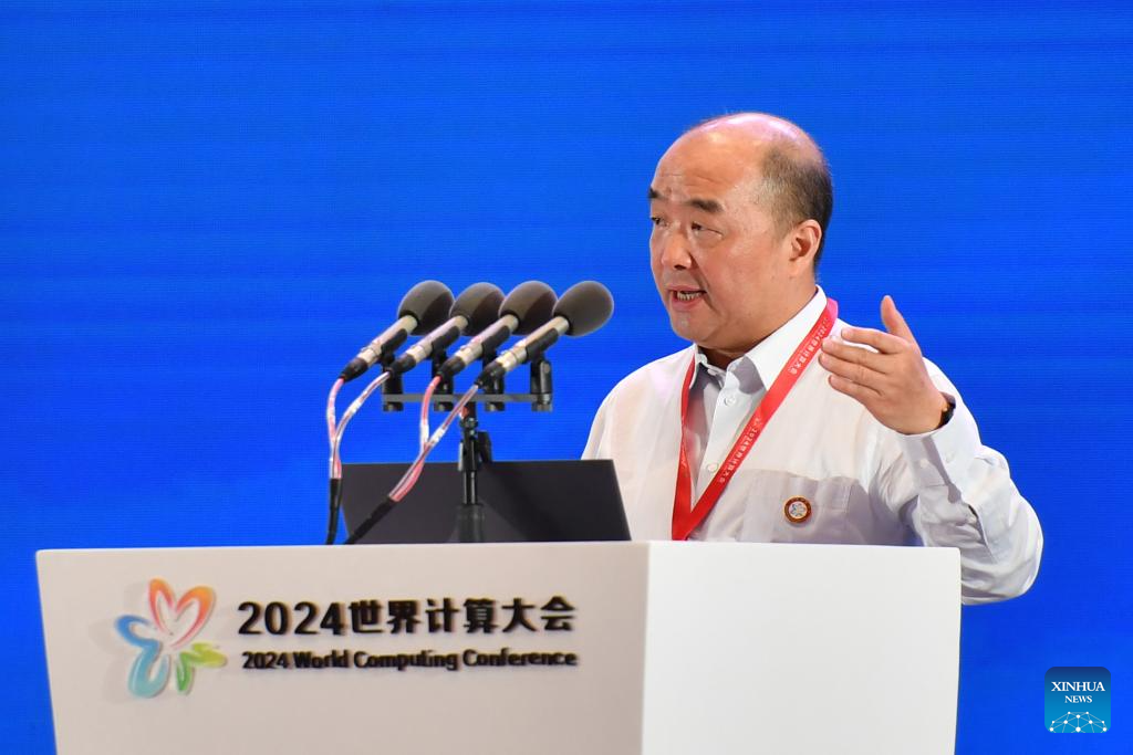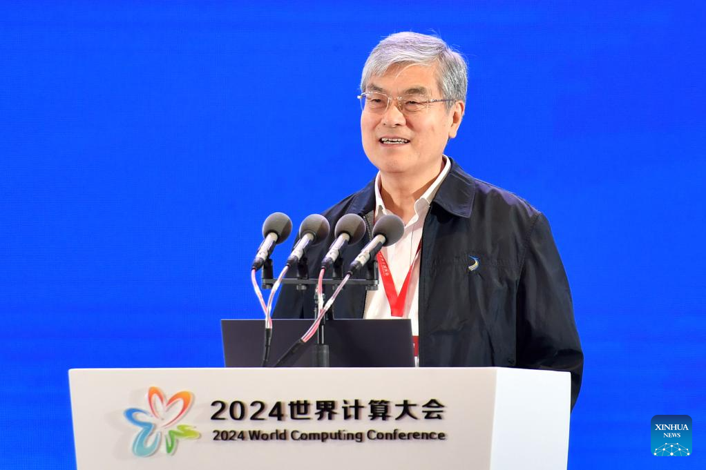 Wang Huaimin, an academician with the Chinese Academy of Science and a professor of the National University of Defense Technology, addresses the opening ceremony of the 2024 World Computing Conference in Changsha, central China's Hunan Province, Sept. 24, 2024. Under the theme "Calculating the World to Create a New Era -- Calculating the New Quality Productive Forces," the conference opened Tuesday in Changsha. (Xinhua/Chen Zhenhai)