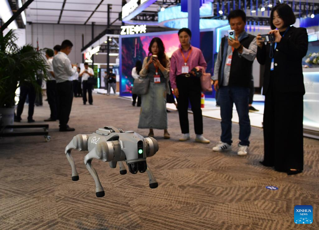 People watch a robot dog demonstration at an exhibition during the 2024 World Computing Conference in Changsha, central China's Hunan Province, Sept. 24, 2024. Under the theme "Calculating the World to Create a New Era -- Calculating the New Quality Productive Forces," the conference opened Tuesday in Changsha. (Xinhua/Chen Zhenhai)
