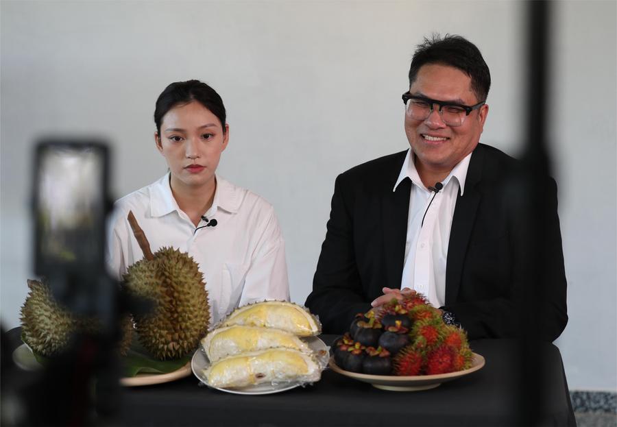 Klos Hirunburana (R), chairman of the Commercial Association for Sustainability of Agriculture (CASA) in Thailand, promotes durians to Chinese netizens through the livestreaming on e-commerce platform Tmall at a durian orchard in Thailand's Chanthaburi province, May 24, 2024. (Xinhua/Sun Weitong)