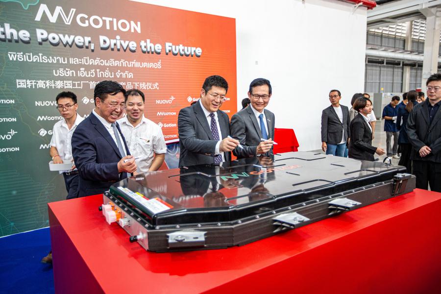 Guests inscribe signatures on the first battery product of NV Gotion jointly established by Gotion High-tech and Nuovo Plus at Siam Eastern Industrial Park in Rayong, Thailand, Dec. 7, 2023. (Xinhua/Wang Teng)