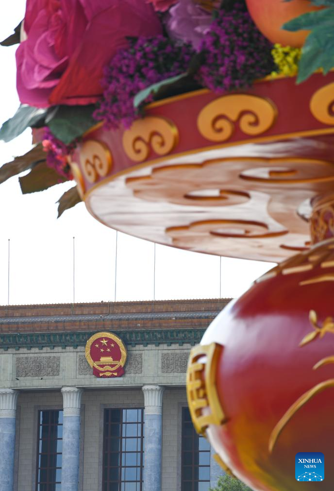 A "flower basket" at Tian'anmen Square is seen with the Great Hall of the People in Beijing, capital of China, Sept. 25, 2024. The 18-meter-tall display in the shape of a flower basket is placed at Tian'anmen Square as a decoration for the upcoming National Day holiday. (Xinhua/Chen Zhonghao)